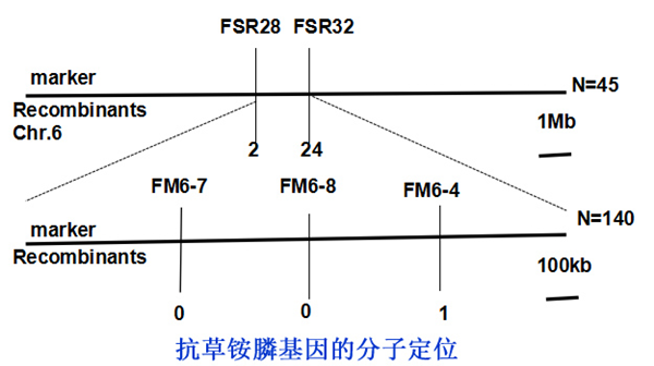 抗草铵膦的水稻新材料能够抵御生产上用于除草的药剂浓度,保障水稻的安全生产,相关的突变基因得到精细定位,申请了发明专利,建立了高效的分子育种体系,从而可以快速定向实现抗草铵膦基因的育种应用。