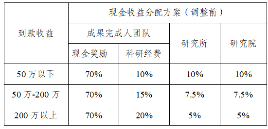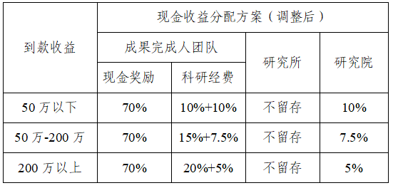为适应科技成果转化新形势,积极鼓励所科研团队通过授权许可、技术转让等方式开展成果转化工作,经所务会研究决定,特对《中国科学院合肥物质科学研究院科技成果转化管理办法》(科合院发科促字【2023】3号)中收益分配条款进行优化调整,将文件中规定的技术许可和转让现金收益分配中所里留存部分返还给成果完成人团队作为科研经费使用,具体分配比例如下: